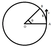 Uvažujme těleso pohybující se po kruhové dráze o poloměru r znázorněném výše s lineární rychlostí v. Předpokládejme, že se těleso pohybuje z bodu A do B po kružnici po kružnici o vzdálenost s a v časovém úseku t překonává úhel θ.